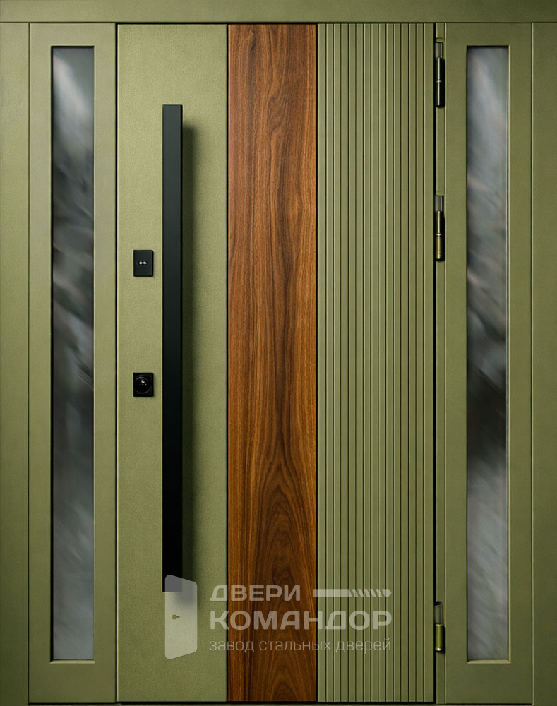 Металлическая дверь оливковая с деревом и остеклением для частного дома №46