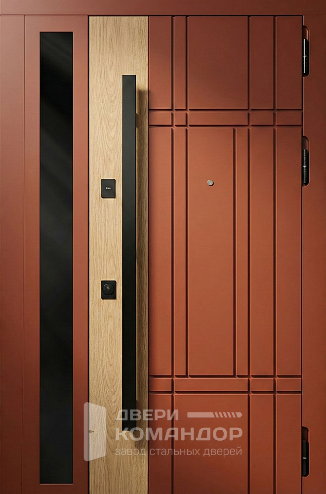 Входная дверь терракотовая со стеклянной вставкой и деревом №100