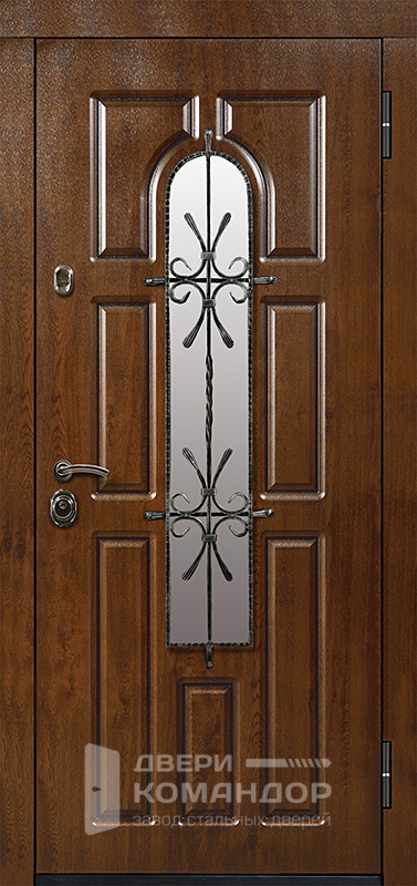 Входная дверь с ковкой размером 86x205 см. на заказ с доставкой и установкой по цене 49580руб. Возможно изготовить по любым индивидуальным размерам. Также возможно боковые вставки и фрамугу в стиле и цвете двери. Изменение цвета отделки и фурнитуры не влияет на стоимость.