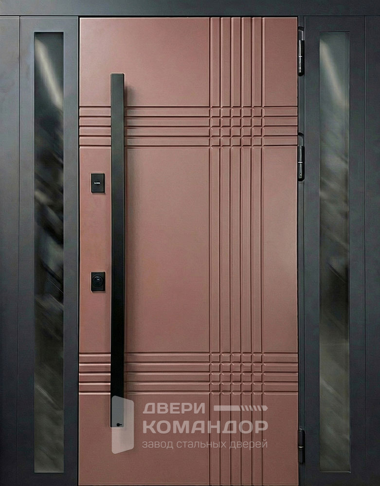 Стальная дверь терракотовая с геометрической фрезеровкой и боковым остеклением №50