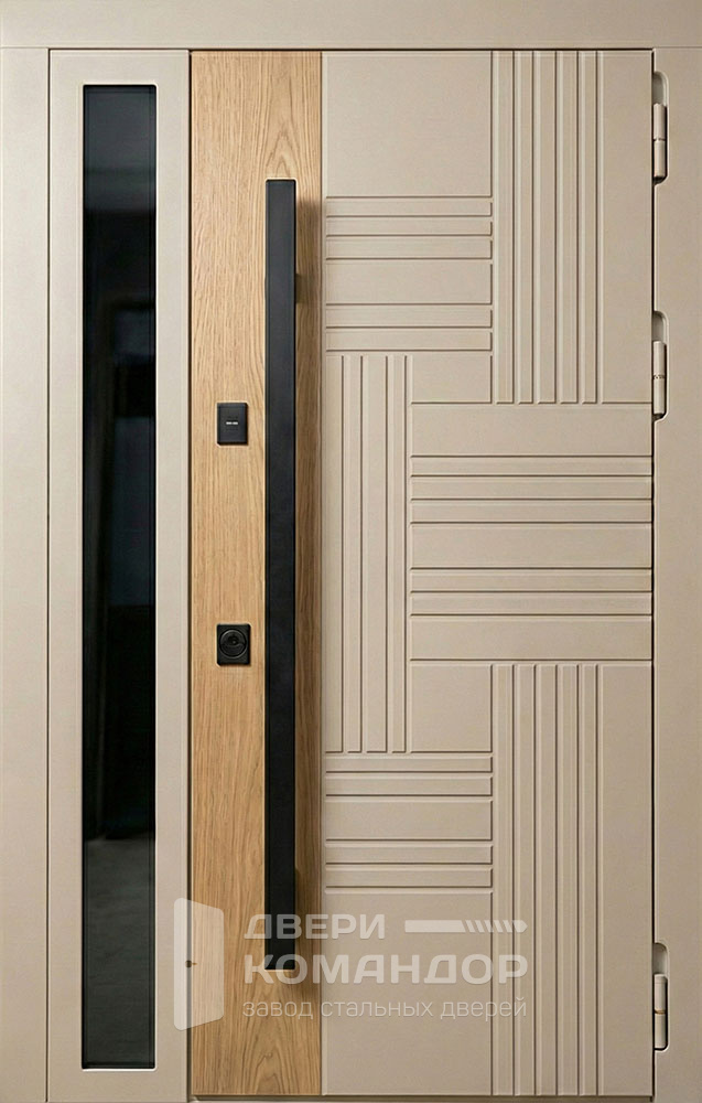 Входная бежевая дверь с боковым стеклом и дубовой вставкой №130 - наружная сторона