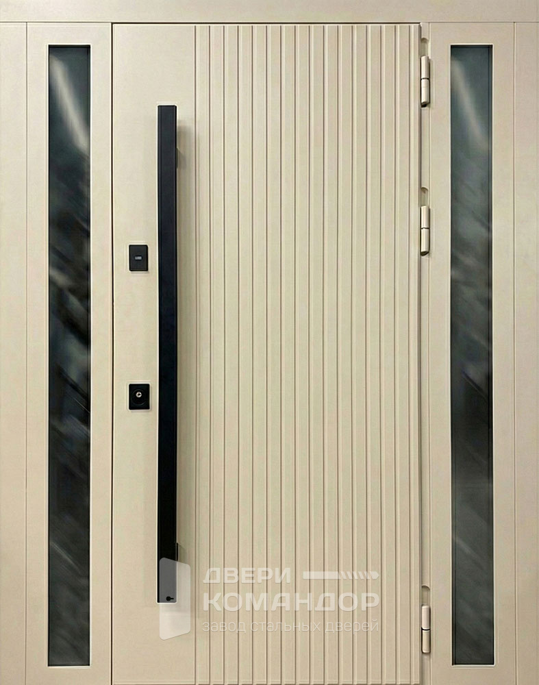 Входная дверь айвори с вертикальными рейками и боковыми стеклопакетами №55