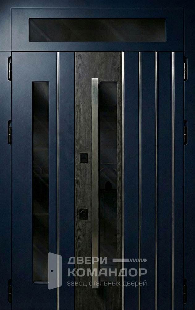 Железная входная дверь синяя с вертикальными линиями и стеклянными вставками №127 - наружная сторона
