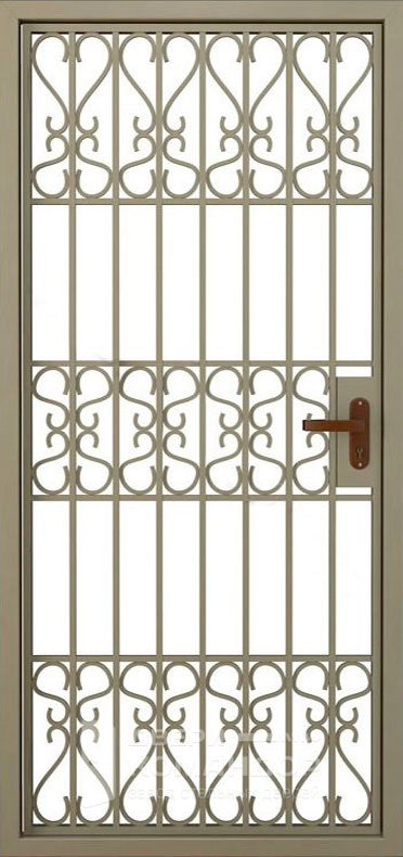 Металлическая решетка дверь защитная размером 86x205 см. на заказ с доставкой и установкой по цене 22040руб. Возможно изготовить по любым индивидуальным размерам. Также возможно боковые вставки и фрамугу в стиле и цвете двери. Изменение цвета отделки и фурнитуры не влияет на стоимость.