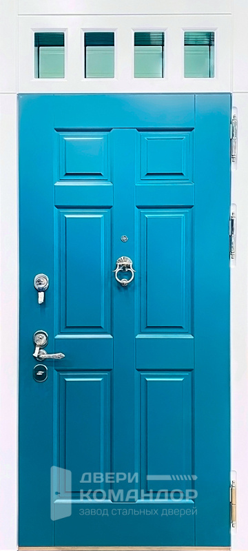 Бирюзовая входная дверь с белой фрамугой и стеклом №54