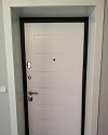 Эта входная дверь рассчитана на квартиру: снаружи стойкое порошковое покрытие против царапин и потертостей подъезда, внутри — белая МДФ-панель под ПВХ с горизонтальной фрезеровкой, которая визуально расширяет проем и легко отмывается без риска вздутия. Гладкая плоскость без лишнего декора смотрится актуально, а темная коробка задает аккуратный контраст и обрамляет полотно. ПВХ-пленка не выгорает при рассеянном свете лестничной клетки, не боится влажной уборки, держит ежедневные касания. Два замка с раздельными цилиндрами распределяют защиту по уровням, глазок дает обзор площадки, уплотнение по периметру гасит хлопок и запахи из подъезда. Получается практичная городская классика: чистый белый внутри, прочная фактура снаружи, минимум ухода — максимум порядка у входа.