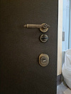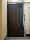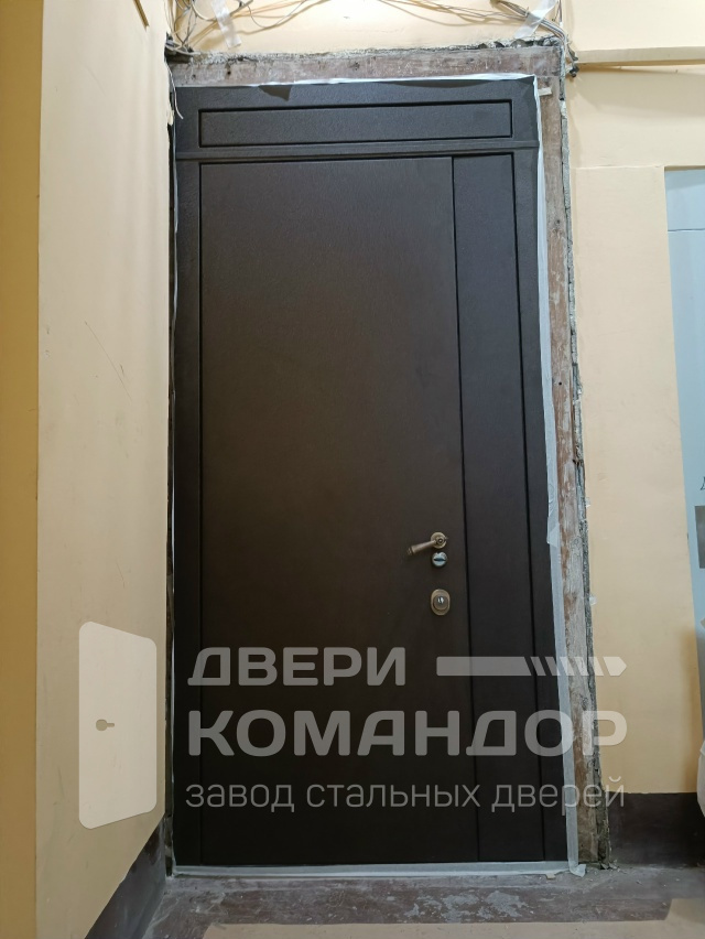 Полуторная входная дверь для квартиры в подъезд: основная створка работает ежедневно, узкая дополнительная — выручает при заносе техники и мебели. Сверху аккуратная фрамуга закрывает высокий проём без громоздких доборов, выглядит цельно и аккуратно. Снаружи — сдержанная МДФ-накладка тёмного тона, устойчивая к повседневным касаниям и не боящаяся уборки; внутри — белая МДФ с классическими филёнками, она освежает прихожую и визуально добавляет света. Трёхсистемный замок Меттэм даёт плотную прижимку и уверенное запирание, без люфтов и капризов. На петлевой стороне — противосъёмные штыри, торец усилен ригелями. Фурнитура в тёплом металлическом оттенке ставит аккуратный акцент.