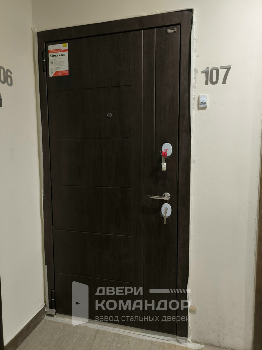 Дверь для квартиры с понятным характером: снаружи — тёмное полотно под венге с вертикальной фрезой, внутри — светлая панель тёплого оттенка с горизонтальными вставками, которые визуально расширяют прихожую. МДФ с обеих сторон держит геометрию, гасит шум подъезда, устойчив к повседневным касаниям и легко очищается без следов. У Bravo R-3 аккуратные овальные броненакладки и ровная посадка фурнитуры, глазок даёт широкий обзор, уплотнение по периметру убирает сквозняки, а массивные ригели по торцу закрывают дверь плотно и тихо. Полотно ходит мягко, ручка лежит в руке уверенно, закрывание звучит «дорого». При необходимости наличники и доборы можно выполнить в цвет полотна, а интерфейс с видеодомофоном — предусмотреть сразу на этапе сборки.