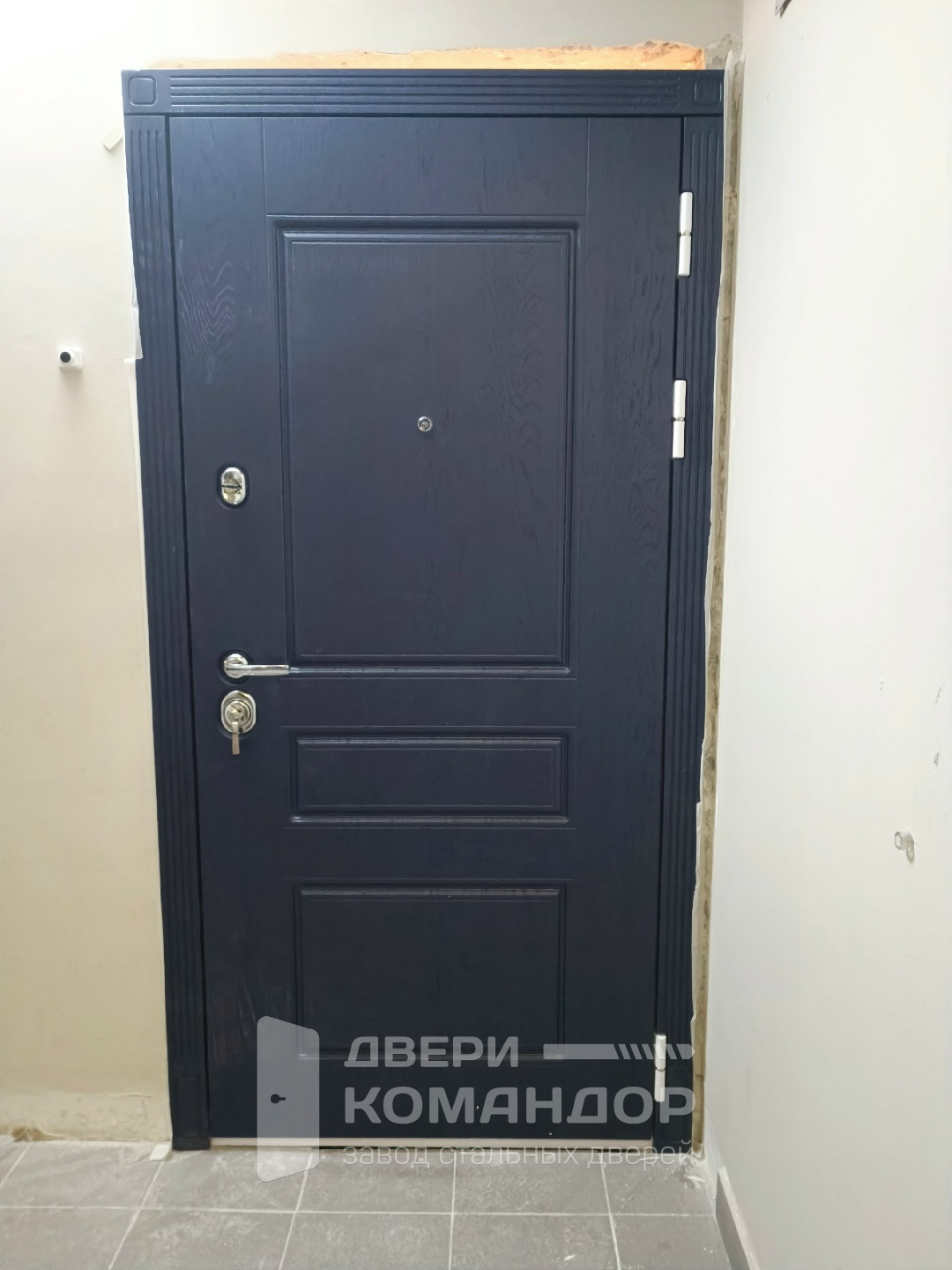 Снаружи — глубокий роял синий с выразительной древесной текстурой и аккуратными филёнками, изнутри — спокойный белый софт, который подсвечивает прихожую и легко сочетается с любой отделкой. Эта дверь уместна в квартиру или подъезд: МДФ-панели выглядят солидно, устойчивы к мелким царапинам и не требуют сложного ухода, а при необходимости наличники и доборы подберём в тот же цвет. В середине хочется отметить диву МД-45 роял синюю и М7 белую в софте: гармоничный контраст, продуманная фурнитура, глазок на обе стороны, два раздельных замковых узла с бронированной накладкой. На петлевой стороне — противосъёмный штырь, чтобы дверь оставалась на месте даже при попытке снять полотно. Опционально интегрируем видеодомофон — проводка и место под монтаж предусмотрены.