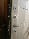ДС Porta S-3P — аккуратное решение для квартиры в типовой серии: полотно собирает проём и за счёт расширения формы закрывает неровности после демонтажа старой коробки. Снаружи — тёмная древесная фактура с горизонтальными делениями: выглядит солидно, маскирует следы касаний и долго держит цвет. Внутри — светлая МДФ-накладка с мягкой текстурой, которая визуально расширяет прихожую и легко моется. По периметру — плотный контур уплотнения для тишины и мягкого закрывания. Усиленная система запирания с девиаторами фиксирует дверь в нескольких точках, а штыри на петлевой стороне страхуют от снятия. Хромированная фурнитура на контрасте подчёркивает строгую геометрию полотна. Спокойный минимализм, который одинаково уместен и в светлом, и в тёмном интерьере подъезда.