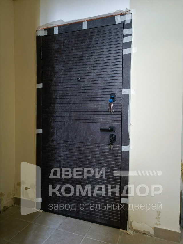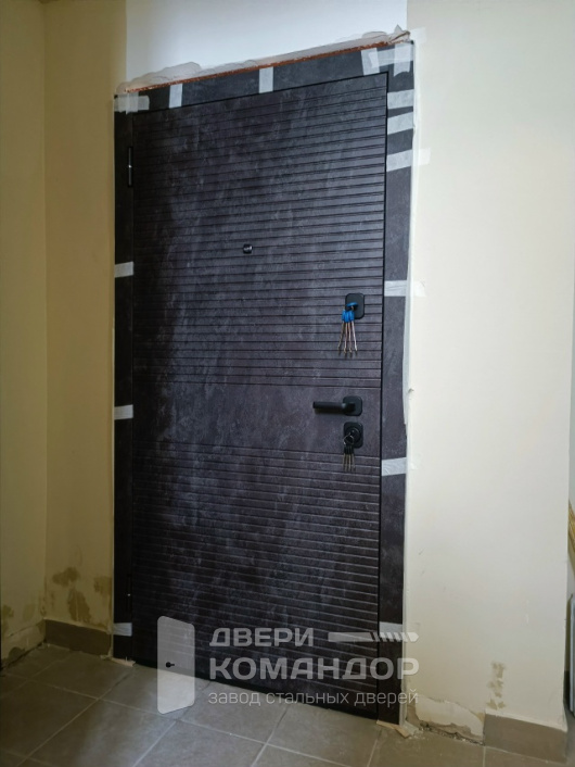 «Горизонт бетон снежный царга» — городская дверь для квартиры, где важны тишина, порядок и чистые линии. Снаружи — темная МДФ-панель с горизонтальными проточками: фактура в духе бетона скрывает бытовые следы и не боится частой уборки. Изнутри — светлая «бетонная» накладка с тонкими горизонтальными вставками, которые визуально вытягивают проем и добавляют света узкому коридору. Плотный прижим по контуру и эластичные уплотнители глушат подъездные шумы и сквозняки. Замковая группа запирает полотно в нескольких точках, наружный цилиндр закрыт броненакладкой, изнутри — удобный поворотник; на петлевой стороне предусмотрен противосъемный штырь. Глазок дает широкий обзор площадки, матовая черная фурнитура ощущается ухватистой и не скользит. Спокойная, практичная дверь, которая день за днем держит форму и стиль.
