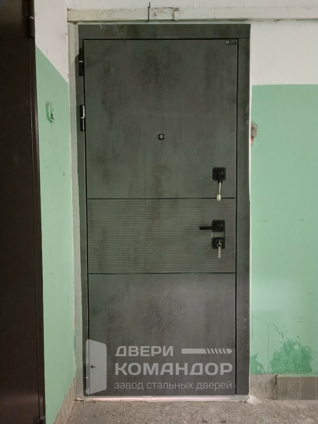 Металлическую основу этой двери вы не видите, но чувствуете по весу и плотному ходу полотна: снаружи — строгий темно-серый декор под бетон с горизонтальной рифлёной зоной, которая прячет следы касаний и визуально вытягивает проём в узком подъезде. Внутри входная дверь Infinity белый софт Лабиринт с расширением проема встречает спокойной матовой белизной и аккуратной фрезеровкой в виде лаконичного «лабиринта» — её легко протирать, МДФ не боится перепадов температуры в лестничной клетке и даёт дополнительную шумоизоляцию. Контрастная чёрная фурнитура на квадратных накладках смотрится современно и не царапается, а возможность сделать доборы и наличники в тон и заранее предусмотреть место под видеодомофон помогает собрать аккуратный, законченный вход в квартиру типовой серии П46/12 без лишних компромиссов.