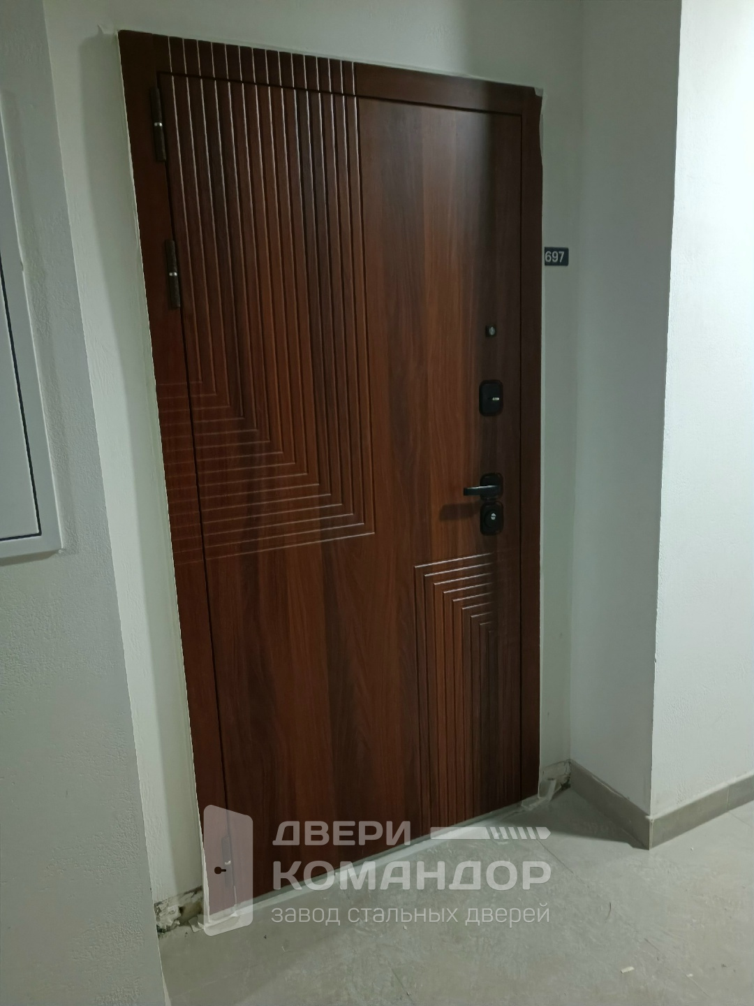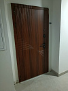 Эта дверь создана для квартиры в современном подъезде: снаружи вы видите строгую панель под итальянский орех с графичными диагональными линиями, которые аккуратно «ломают» плоскость полотна и не надоедают годами. Изнутри — большое зеркало почти во весь рост в тёплой деревянной раме: удобно поправить одежду перед выходом и визуально расширить узкий коридор. Металлическое полотно закрыто МДФ-накладками, устойчивыми к царапинам и бытовой влажности, их легко протереть, они не боятся частых уборок и искусственного освещения подъезда. Короб и торец полотна окрашены под коричневую «крокодиловую кожу» — фактура скрывает мелкие сколы и следы эксплуатации, при этом дверь выглядит аккуратно даже через несколько лет. Несколько контуров уплотнения глушат шумы и запахи, а чёрная матовая фурнитура, глазок и замковая группа поддерживают спокойный минималистичный стиль и чувство защищённости.