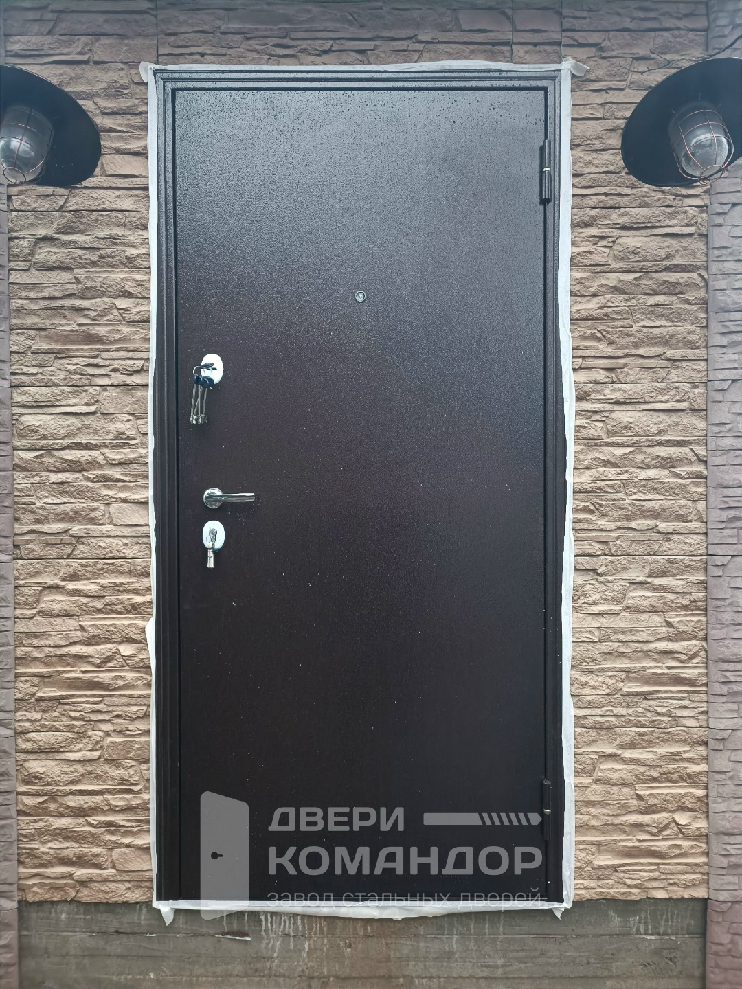 Надёжная входная дверь для частного дома: снаружи — стойкая порошковая шагрень глубокого тёмно-коричневого оттенка, не боится дождя и грязи, следы от рук почти незаметны и легко смываются. Внутри — МДФ под тёмное дерево с чёткой геометрией панелей: прихожая выглядит теплее и аккуратнее. По периметру идут уплотнители, притвор плотный — тише в доме и меньше запахов с улицы. Два замка с раздельным управлением и внутренней вертушкой работают мягко, фиксируя полотно в нескольких точках. На торце — противосъёмный штырь, петли усиленные. Глазок даёт хороший обзор, хромированная фурнитура свежо контрастирует с тёмной гаммой. Практичное решение на улицу под навес или в холодный тамбур, когда хочется сдержанного вида и реальной защиты.