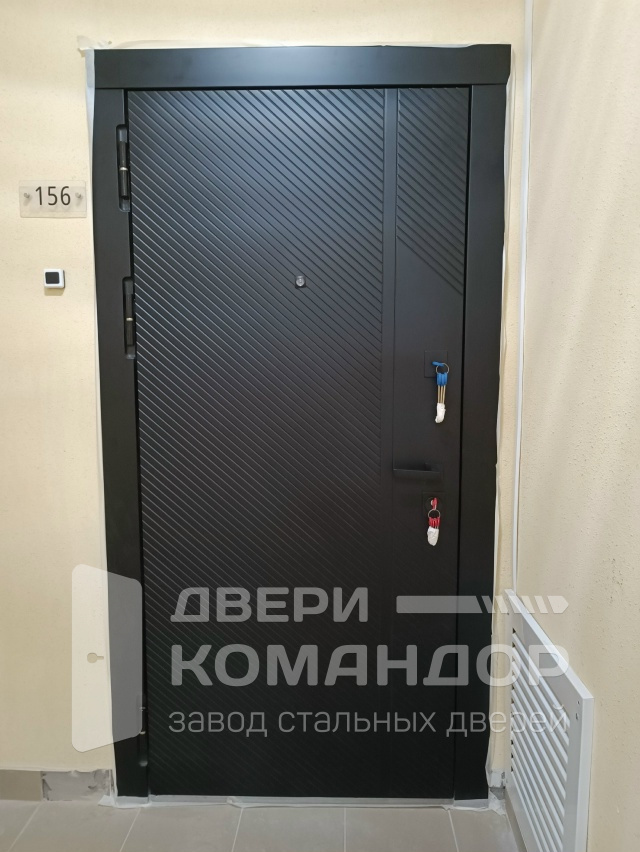 Входная дверь с временной панелью — практичное решение для квартиры во время ремонта: снаружи уже установлена тёмная МДФ-панель с диагональным рельефом и строгой геометрией, внутри — защитная временная плита, закрывающая чистовую облицовку от пыли и ударов; после отделки её заменим на выбранную вами МДФ. Полотно прижимается по двум контурам уплотнения, мягче закрывается и заметно гасит шум из подъезда. Многоточечное запирание уводит ригели по стойке, на петлевой стороне — противосъёмные штыри, глазок обеспечивает обзор. Матовая фактура не бликует и легко отмывается, а дизайн лицевой панели смотрится современно даже на фоне строительной пыли — вход уже «готов», даже если в квартире ещё идут работы.