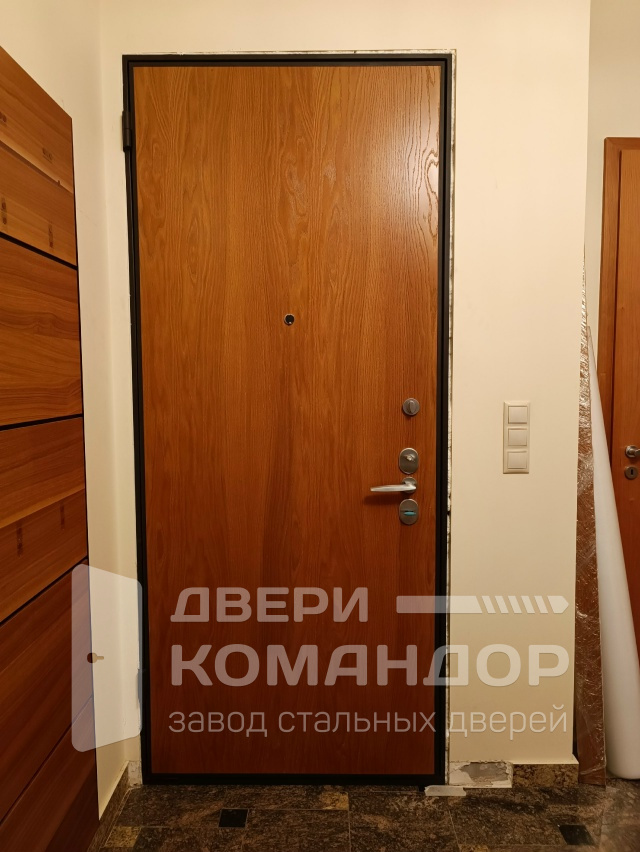 Stardis Expert — аккуратная входная дверь для квартиры с внутренним открыванием: надежная база и спокойный, «домашний» внешний вид. Обе стороны отделаны МДФ под светлое дерево — поверхность стойкая к повседневным царапинам, легко моется, не теряет оттенок в коридорном свете и гармонирует с мебелью. Сердце конструкции — двухсистемный Mottura: независимые механизмы управляются раздельно, а мощные ригели заходят глубоко в короб, фиксируя полотно без люфтов. Удобная нажимная ручка не скользит, цилиндр защищен броненакладкой, глазок дает широкую картинку площадки — мелочи, которые каждый день работают на безопасность и комфорт. Короб и кромки выполнены в темном тоне, подчеркивающем светлую фактуру панелей. Дверь смотрится солидно и современно, не перетягивая внимание, — ровно то, что нужно для городского подъезда.