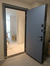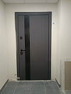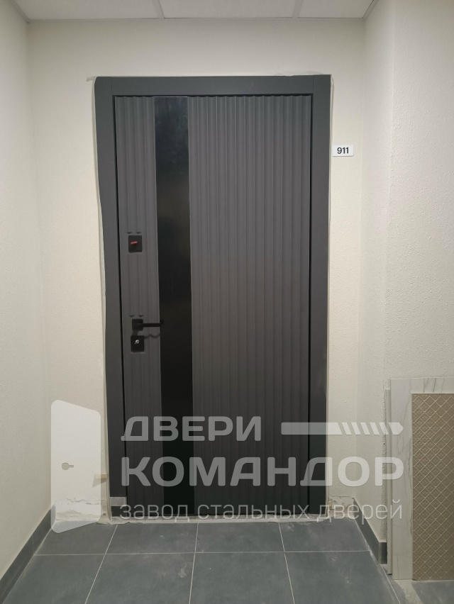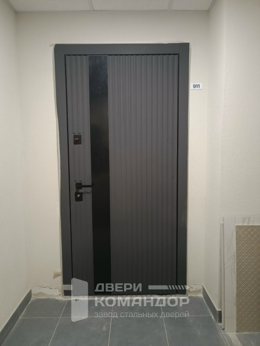 Это входная дверь для квартиры, которая играет фактурой и светом: снаружи — графитовая панель МДФ с вертикальным рельефом и узкой чёрной вставкой-молдингом, создающей стройный, «вытянутый» силуэт проёма. Поверхность практична: следы касаний не заметны, мелкие царапины не бросаются в глаза, ухаживать просто. Изнутри — спокойная гладкая плита МДФ в холодном серо-голубом тоне: не спорит с отделкой прихожей и визуально добавляет воздуха. Механика радует не меньше дизайна: многоточечное запирание с выдвижными ригелями, внутренняя задвижка для быстрого блокирования, усиленные петли и плотный контур уплотнения — дверь закрывается мягко и глушит звуки с площадки. Итог — аккуратный современный вход без лишнего декора, где стиль и удобство идут в одной связке.