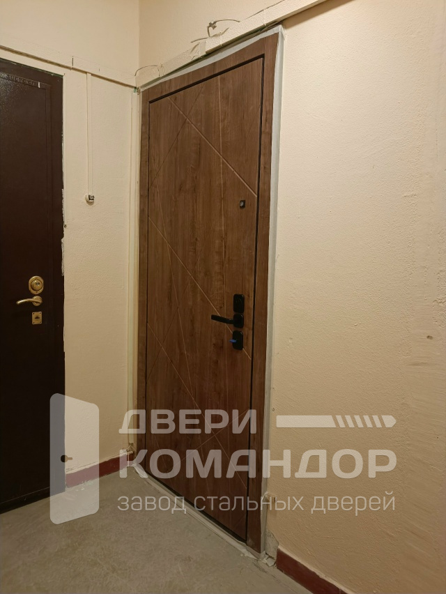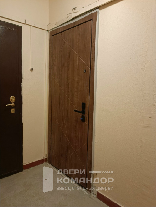 Аккуратная входная дверь для квартиры: снаружи тёплая древесная фактура с диагональной фрезеровкой задаёт спокойный, современный ритм подъезда, внутри — лаконичная белая панель, которая не спорит с отделкой прихожей. Обе стороны выполнены из МДФ: внешний лист стойко переносит бытовые нагрузки, не боится мелких царапин и легко моется, внутренний поддерживает чистую геометрию и визуальный порядок. Надёжность — за счёт двухсистемного замка Mottura с девиаторами: полотно запирается в нескольких точках, а противосъёмные штыри держат дверь на месте даже при попытке взлома со стороны петель. Глазок даёт контроль над ситуацией, а расширение проёма закрывает неровности стены и формирует аккуратный, «заводской» край. Итог — спокойная эстетика и уверенная механика без лишнего пафоса.