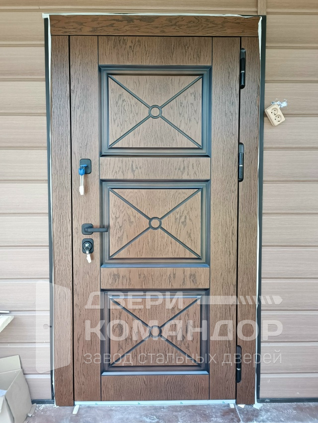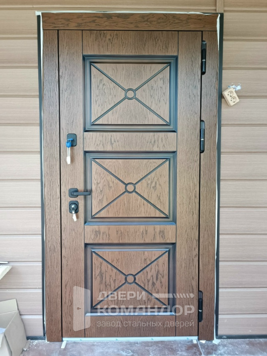 Эта дверь создана для частного дома и уверенно работает на улице: снаружи — фактурный шпон под дерево с объёмными косыми филёнками, внутри — белая панель с высоким зеркалом-эмалью, которое добавляет свет и визуально расширяет прихожую. Металл окрашен в два цвета: чёрная коробка подчёркивает контур, белое полотно изнутри поддерживает современный интерьер. МДФ-накладки устойчивы к царапинам и выгоранию, легко моются. Терморазрыв разрывает мост холода, снижая конденсат и сквозняки. Магнитные уплотнители мягко подтягивают полотно без хлопка, нержавеющий порог не боится влаги и реагентов. Два разнесённых замка и аккуратная чёрная фурнитура завершают образ и добавляют спокойствия владельцу.