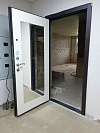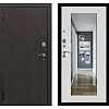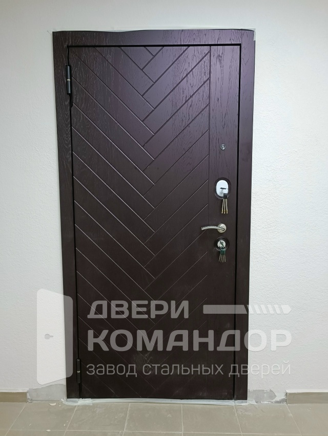 Лаконичная дверь для квартиры в духе лофта: снаружи — темный МДФ с выразительной «ёлкой», фактура скрывает мелкие следы и легко оттирается; внутри — светлая панель с зеркалом во всю высоту, которое заменяет трюмо и визуально расширяет узкий коридор. Модель ориентирована на подъездную установку: несколько контуров уплотнения приглушают шум и запахи, плотный прижим держит теплоту. Два независимых замка фиксируют полотно в разных точках, цилиндр прикрыт броненакладкой, есть глазок для контроля площадки. Усиленный короб и противосъёмные штыри добавляют стойкости к грубому взлому, а хромированная фурнитура с удобной нажимной ручкой завершает спокойный контраст — темный внешний фасад и светлая внутренняя сторона работают на порядок и свет в доме.