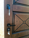 Дверь для частного дома с выходом на улицу: снаружи благородный шпон под дерево с объёмными филёнками, внутри — белая панель с высоким зеркалом-эмалью, которое добавляет света и визуально расширяет прихожую. Металл окрашен в два цвета, поэтому фасад и интерьер выглядят гармонично с обеих сторон. Терморазрыв разрывает мост холода — теплее зимой и меньше конденсата на откосах. МДФ-накладки с износостойким покрытием устойчивы к царапинам и выгоранию, легко ухаживать. Магнитные уплотнители мягко затягивают полотно без хлопка, а порог из нержавейки не боится влаги и реагентов. Надёжная запорная система с раздельными замками и аккуратной фурнитурой завершает образ.